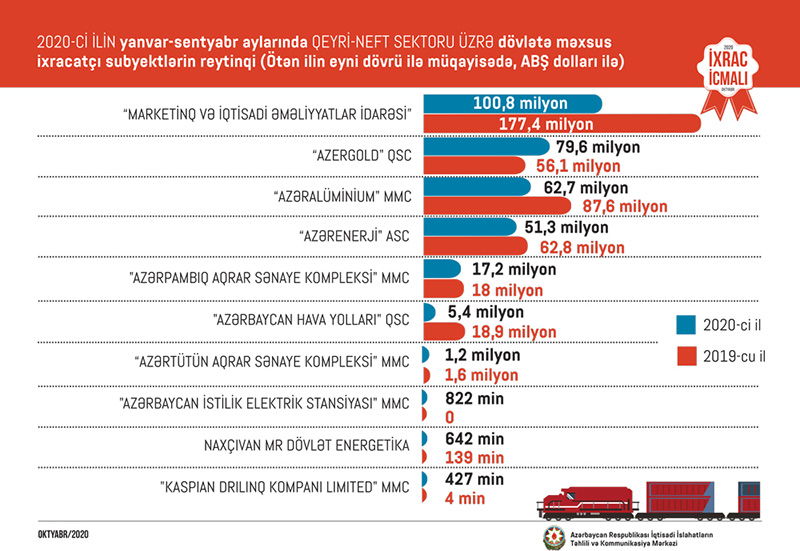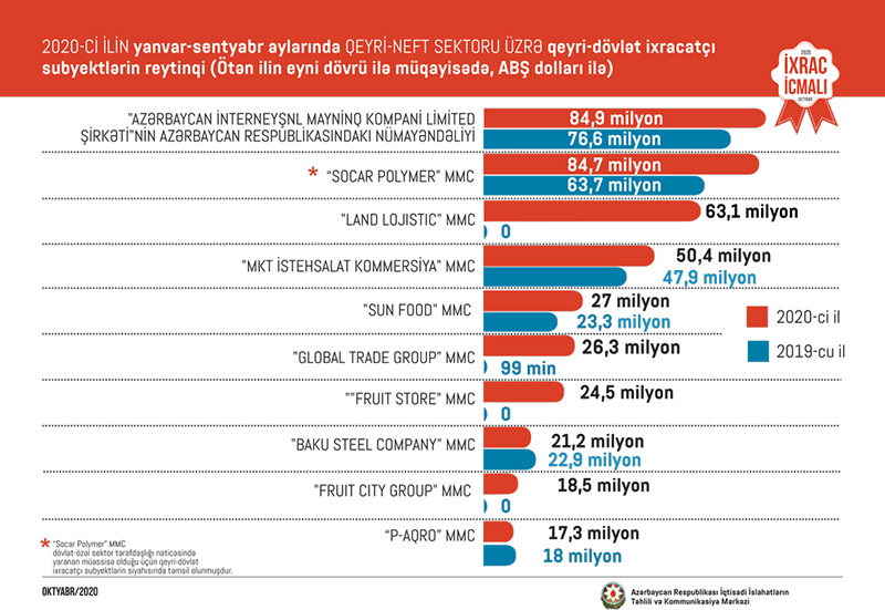 Bu ilin yanvar-sentyabr ayları üzrə hazırlanan qeyri-dövlət ixracatçı subyektlərin reytinqində ilk onluqda aşağıdakı şirkətlər təmsil olunurlar: “Azərbaycan İnterneyşnl Mayninq Kompani Limited Şirkəti"nin Azərbaycan Respublikasındakı Nümayəndəliyi, “Socar Polymer” MMC, "Land Lojistic" MMC, "MKT İstehsalat Kommersiya" MMC, "Sun Food" MMC, "Global Trade Group" MMC, "Fruit Store" MMC, "Baku Steel Company", "Fruit City Group" MMC və “P-Aqro” MMC.