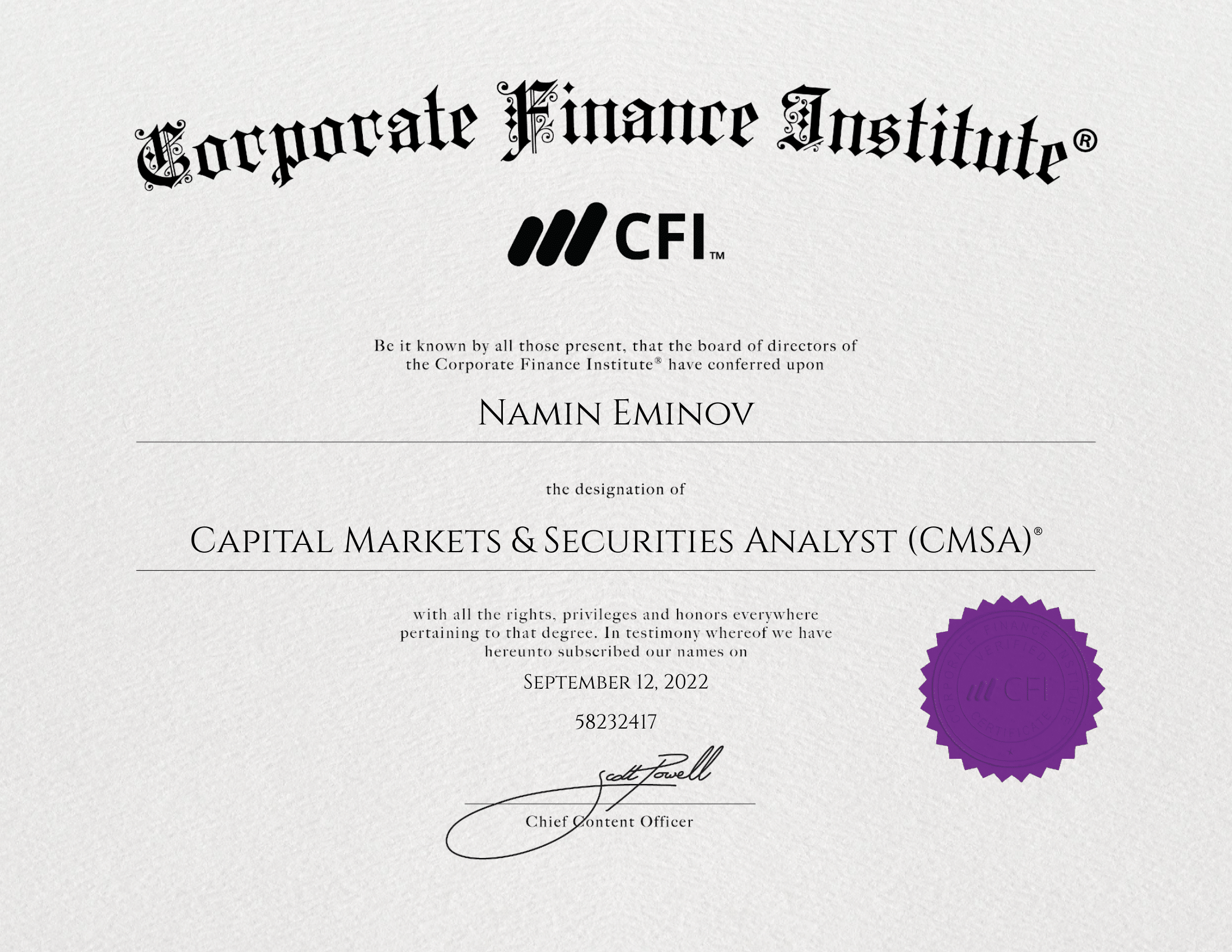 Maliyyə departamentinin bir qrup əməkdaşı - Tale Həsənov, Aynur Kərimova və Namin Eminov mövcud təlim və sertifikasiya proqramlarının əsas istiqamətindən biri olan “Capital Markets & Securities Analyst (CMSA)®” proqramı üzrə təlimləri uğurla başa vuraraq sertifikasiya imtahanında iştirak etmiş və imtahandan uğurla keçərək sertifikatlara yiyələnmişdir.