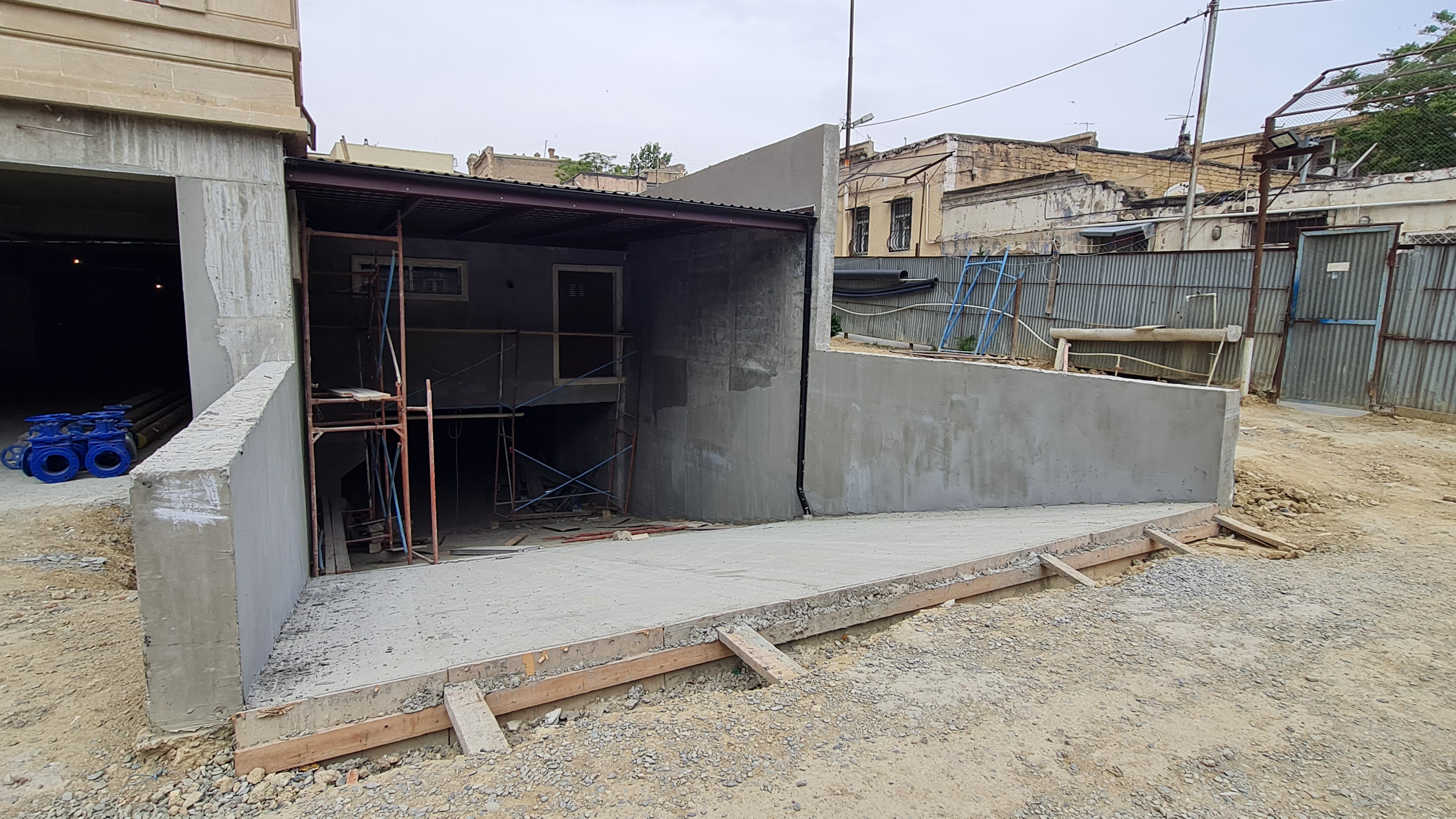 Lev Tolstoy küçəsi səmtində qaraj mərtəbəsinə avtomobillərin sərbəst giriş-çıxışının təmin olunması məqsədilə inşa olunmuş pandusun metal günlüyünün, onun suaxıdıcı novalçalarının və borularının quraşdırılma işləri başa çatdırılmışdır. Paralel olaraq pandusun monolit dəmir-beton xarici divarının hündürlük boyu davamının armatur karkası toxunaraq B25 marka beton ilə betonlanmışdır.