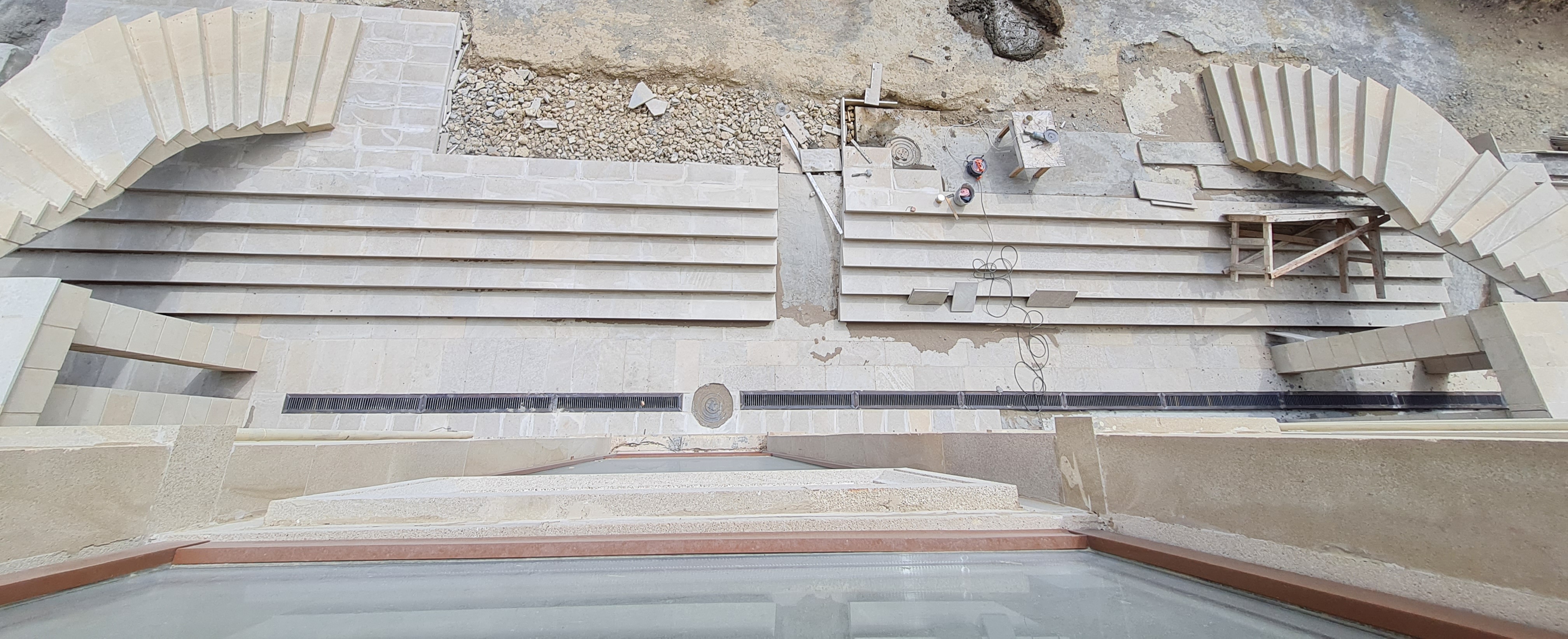 Zərgərpalan küçəsi tərəfdən -8.35 səviyyəsində yerləşən 28 metr uzunluğunda dəmir-beton pilləkənlərin ağlay daşı ilə üzlənməsi işlərinin 90%-i yerinə yetirilmişdir.